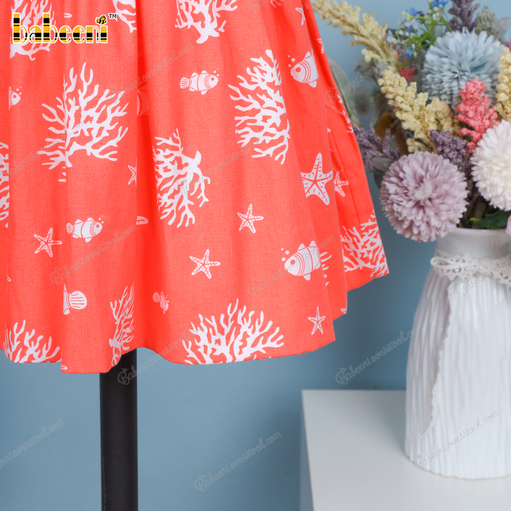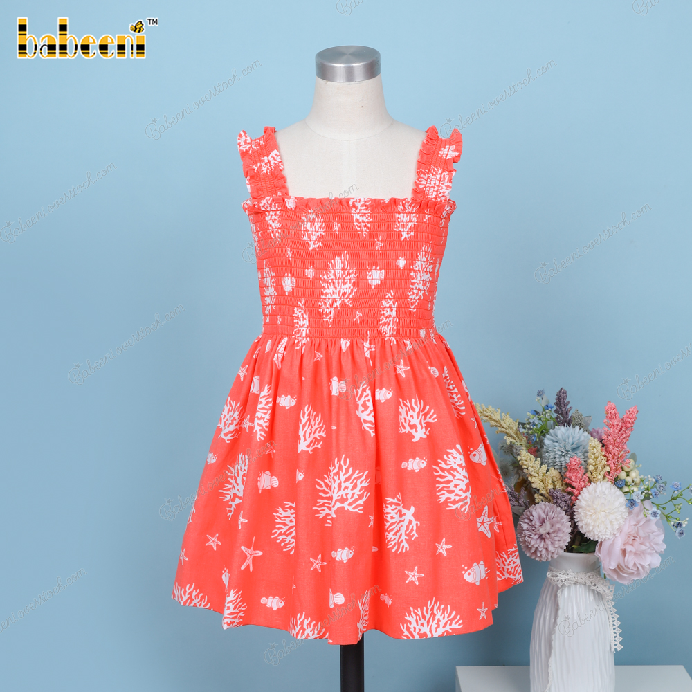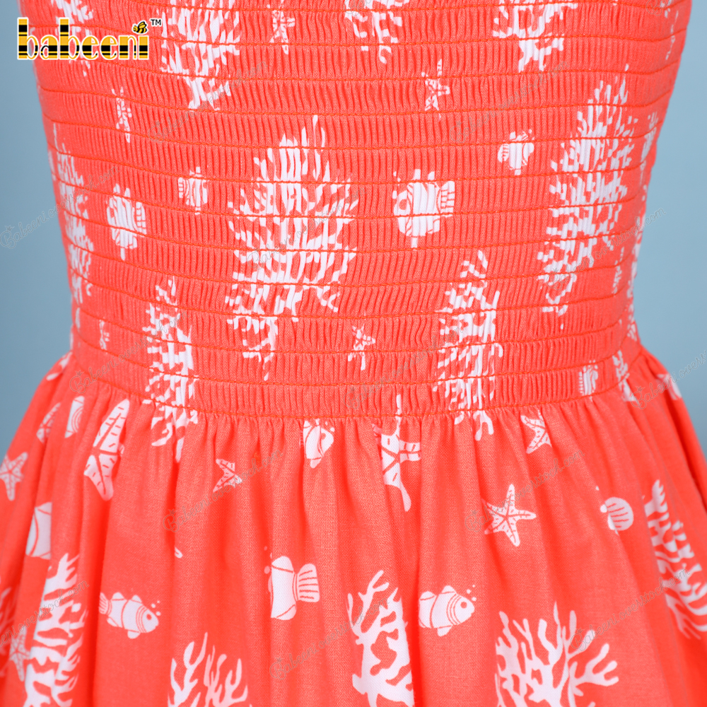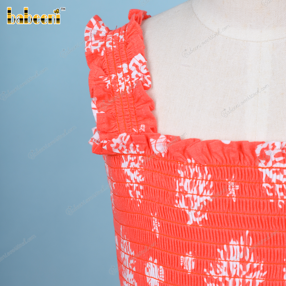 Features: An orange with white corals dress and a Shirred runs along the chest. Your little princess can wear this dress this spring and summer.