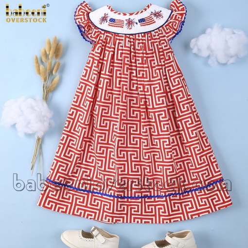 Feature:Adorable dress in bishop style with smocked patterns of the American flag and fireworks on the chest, angle-sleeves, back buttons, embellished with zigzag.