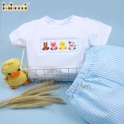Feature: Nice clothing set for little boy with smocked animals on the chest. With perfect combination of white knit and aqua stripe fabric, the set is suitable for summer vacation.