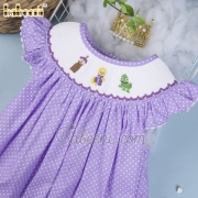 Feature:Beautiful bishop dress for little girl with smocked lighthouse, princess & frog on the chest, angel sleeves, white zigzag on sleeves & hem of dress. It is suitable for summer vacation.