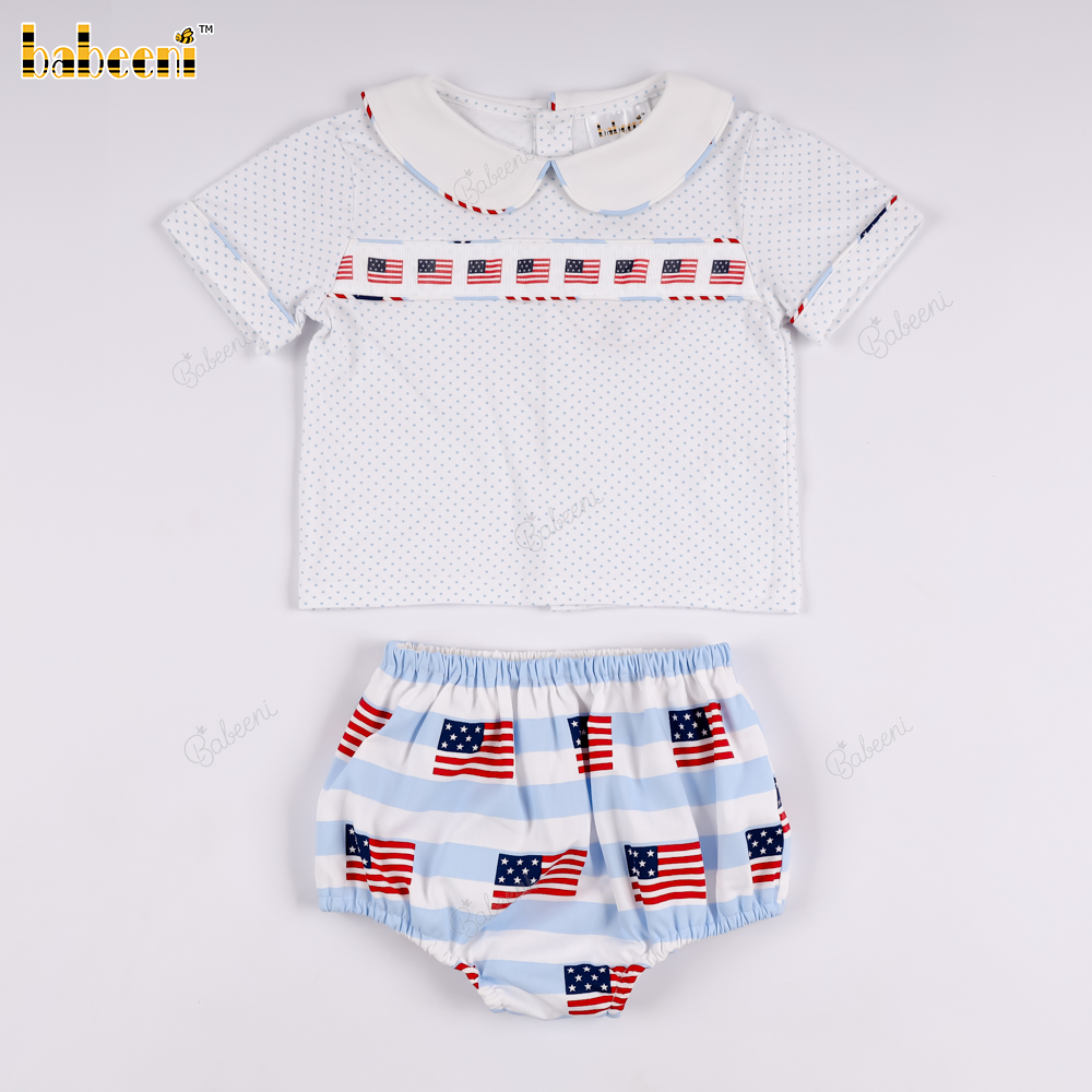 Square-neck t-shirt and bloomer pants set with American flag print.- BB3574
