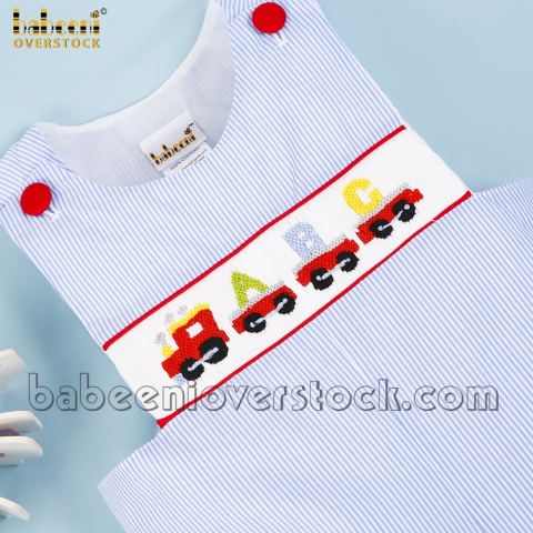 Feature:Cute baby boy romper with Alphabet train smocked pattern on the bodice, shoulder buttons, snap at crotch for easy dressing