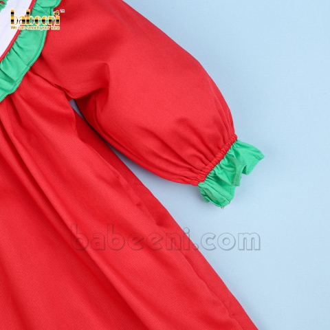 Feature: Pretty dress for little girl on Christmas with wreath hand embroidery patterns on white neck, long sleeves, green ruffles.