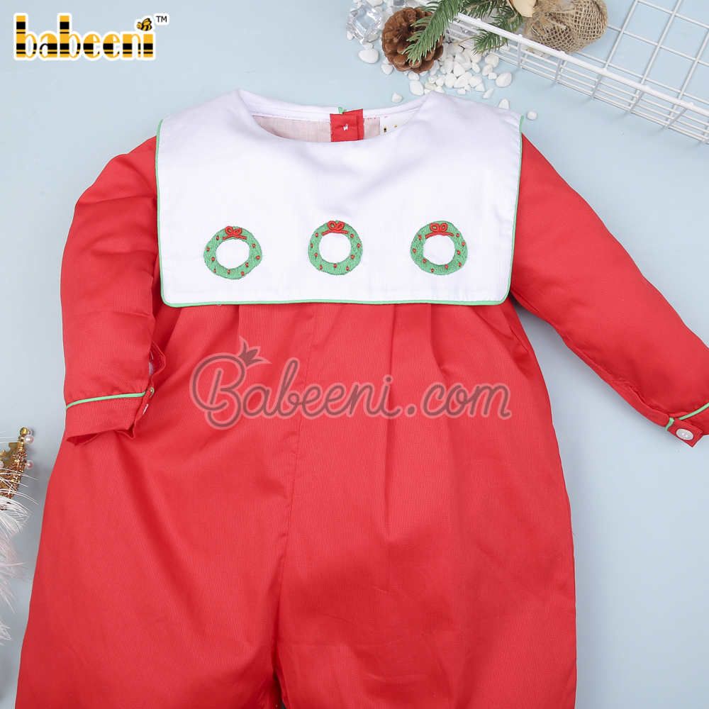 Feature: Nice long bubble for boys with wreath hand embroidery patterns on large white bib, long sleeves, crotch snap