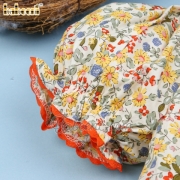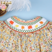 Feature: Beautiful girl smocked bishop dress with geometric hand smocked pattern on yellow and orange flower printed fabric, puff sleeves.