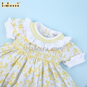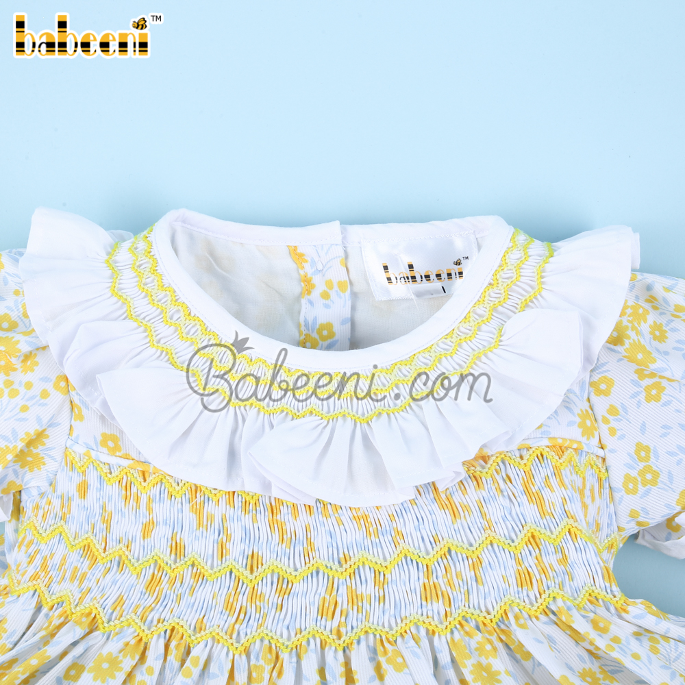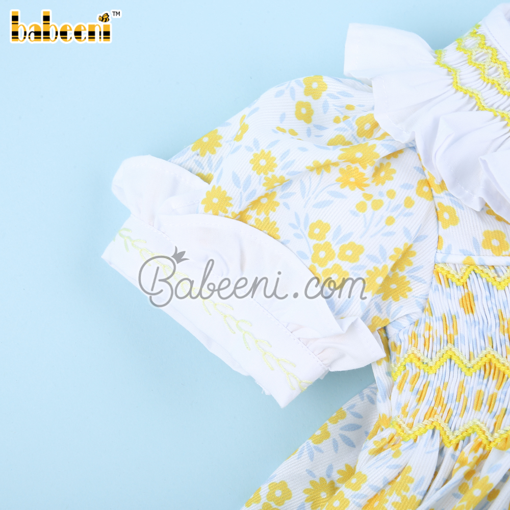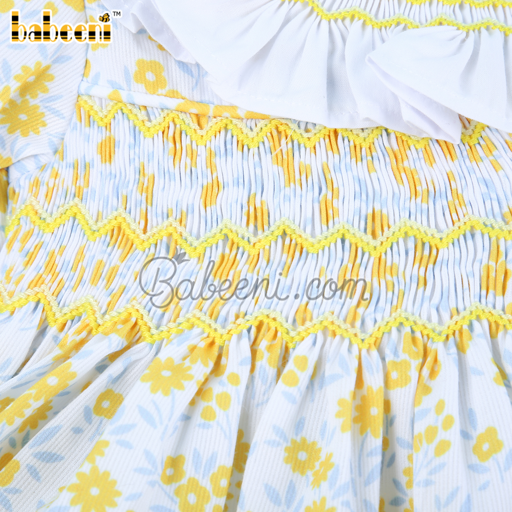 Features: Lovely dress for little girl with yellow flower 4.0 printed, hand-smocked on the chest and around neck, zigzag on hand-smocked, ruffle, puff sleeves. Perfect for Spring Summer. Best gifts for special occasions.